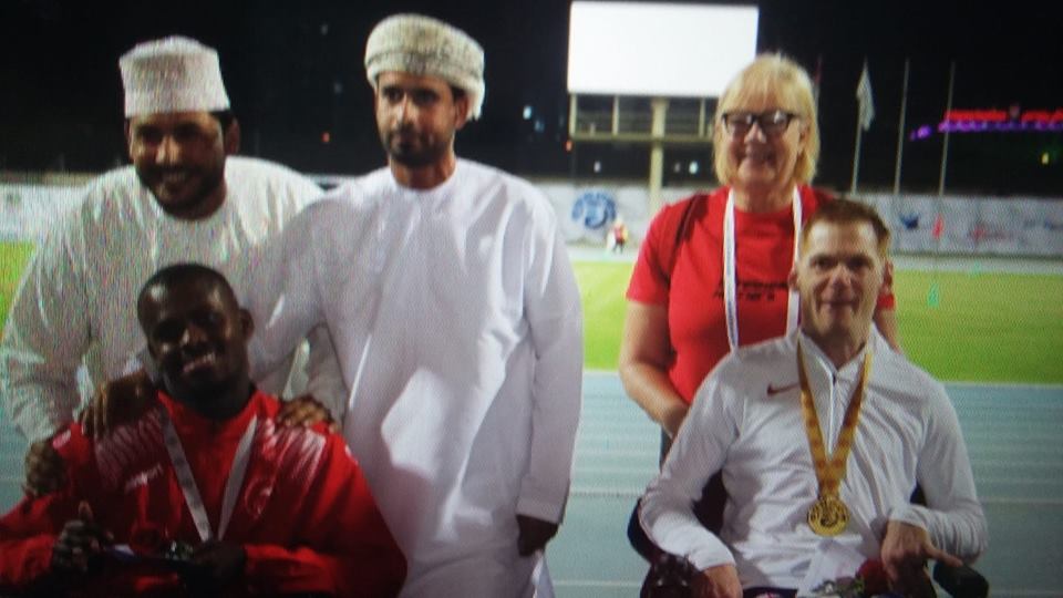 Great competition in Dubai Stephen Miller threw 30m11 to win Gold. Never thrown over 30m before in Dubai IPC GP season opener. Strong field with 12 athletes. He was 11th to throw so had to sit out in the field for about 1 and a half hours before he threw. Great start to the Season. I hope you all notice Ros wore her Gateshead Harriers t-shirt do you think it is lucky