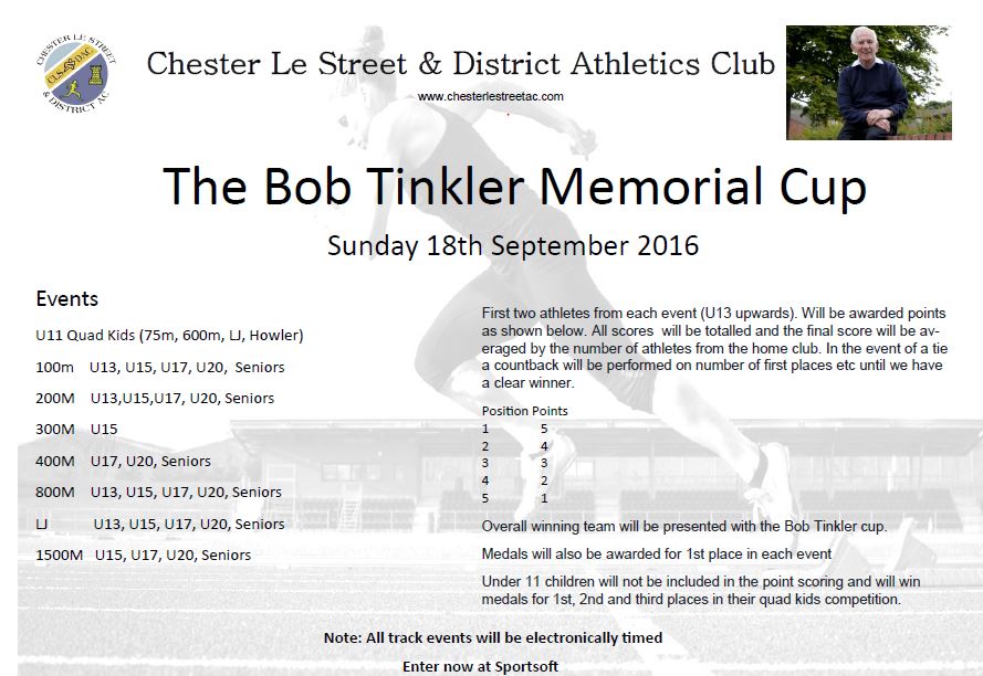 As you may be aware Bob Tinkler the founder member of Chester le street AC passed away just before last Christmas. As a fitting memorial to him; Chester le Street AC are holding an event on the 18th September 2016. This year it will be mainly track based with Long Jump, but we hope that subsequent years will include all track and field events. All track events will be electronically timed and there will be a small quad kids based event for U11 with positions 1-3 in individual events winning medals .